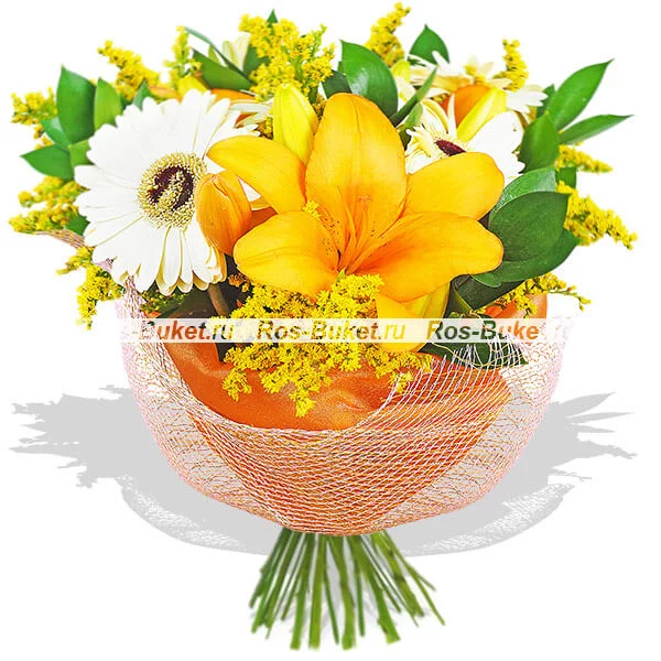 Стандартный (на фото): лилия оранжевая - 2 шт, гербера белая - 5 шт, солидаго - 3 шт, рускус, сетка оранжевая.